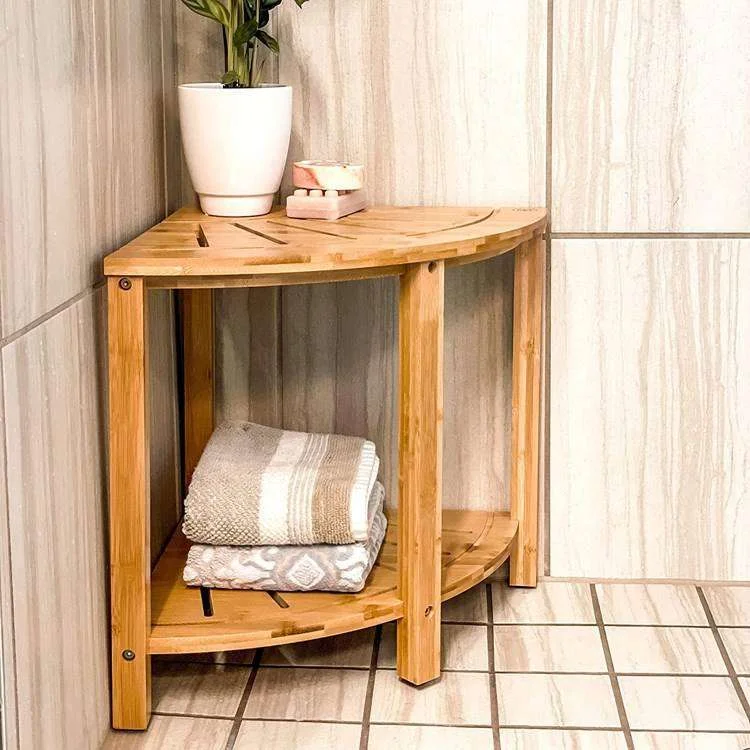 - Heavy-Duty Stability & Safety: Wet tile floors are notorious slip hazards. Our wooden corner shower bench is built with a heavy-duty, reinforced frame. To guarantee safety, we equip the base with premium non-slip rubber feet. This ensures the shelf stays securely planted on wet floors, even when fully loaded with heavy shampoo bottles, conditioners, and body washes.