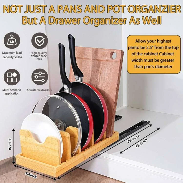 - Adapt to Any Space: Enjoy a versatile multi-use design. While perfect as a kitchen cabinet pan storage solution, it easily transitions into an expandable bamboo dish rack, a bakeware organizer, or even a sleek holder for laptops and office files.