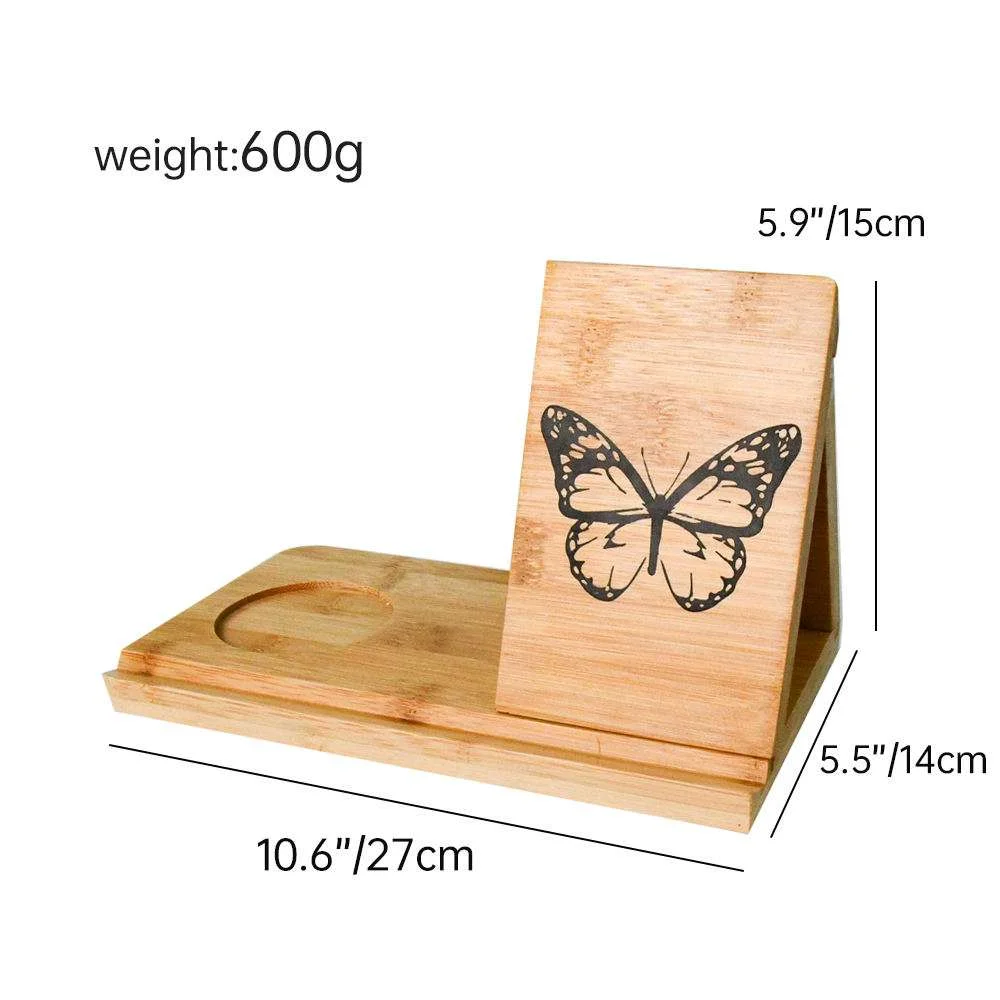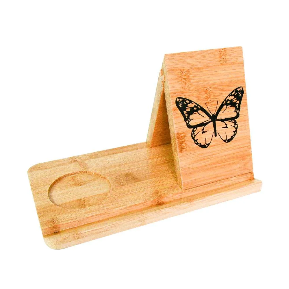 • Butterfly Engraving: A subtle, high-quality butterfly engraving is integrated into the design, adding an elegant, artisanal touch to this natural wood phone support.