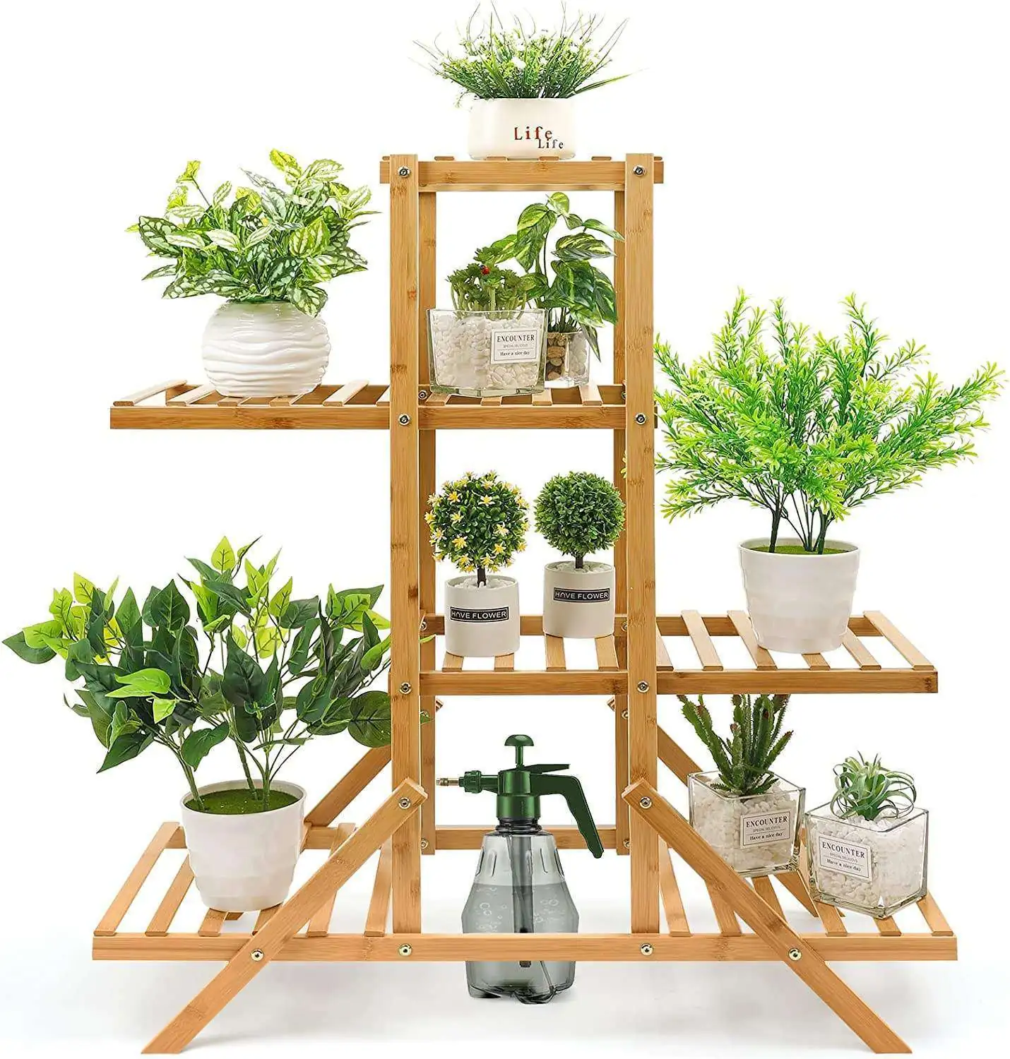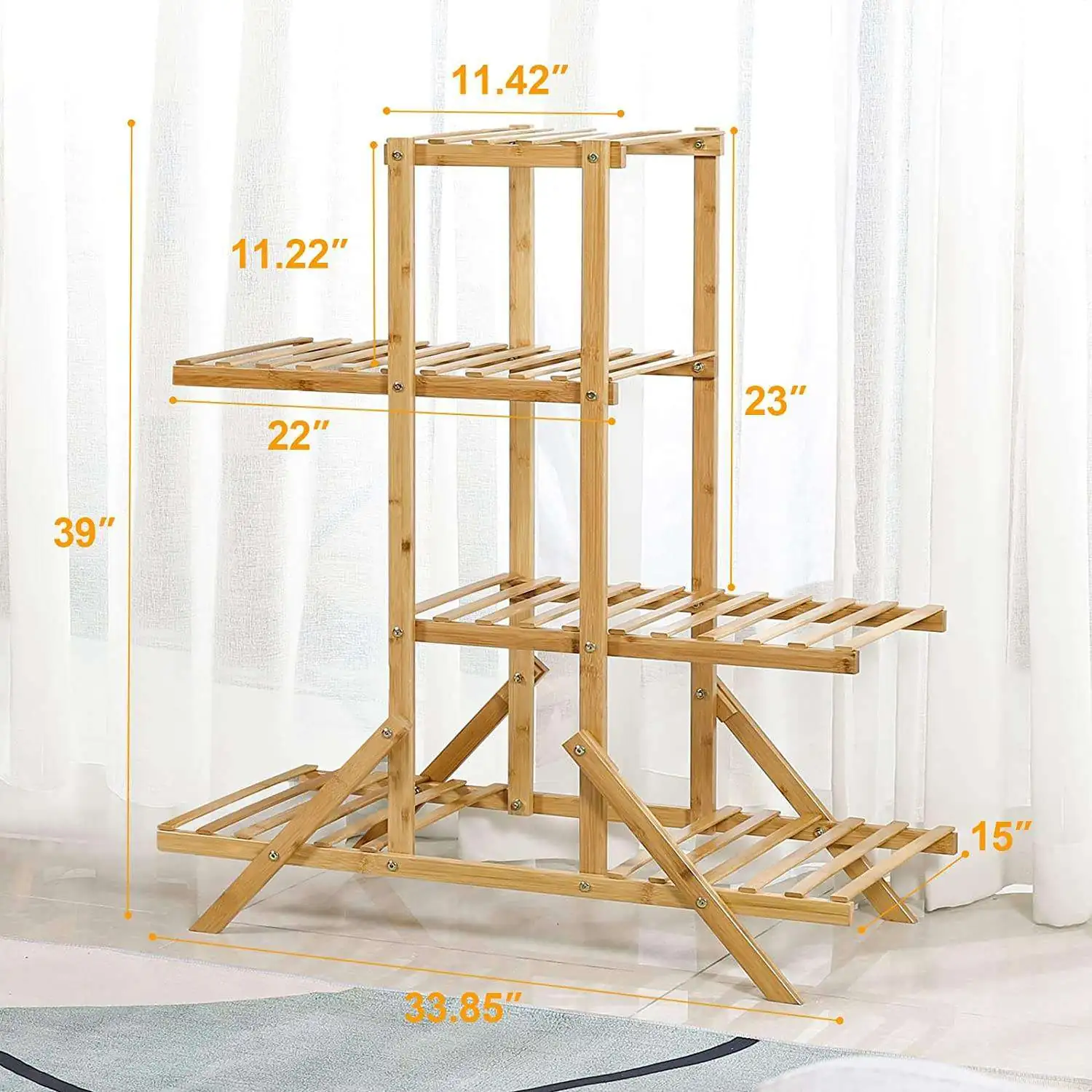 Our heavy duty bamboo flower shelf is engineered with a sturdy A-frame support system. Each tier is designed to support multiple pots, ranging from small 6-tier succulent shelf arrangements to larger decorative planters. While weight capacity varies by the specific tier width (from 11.22″ to 23″), the structure is built to remain stable and tip-resistant under a full load of greenery.